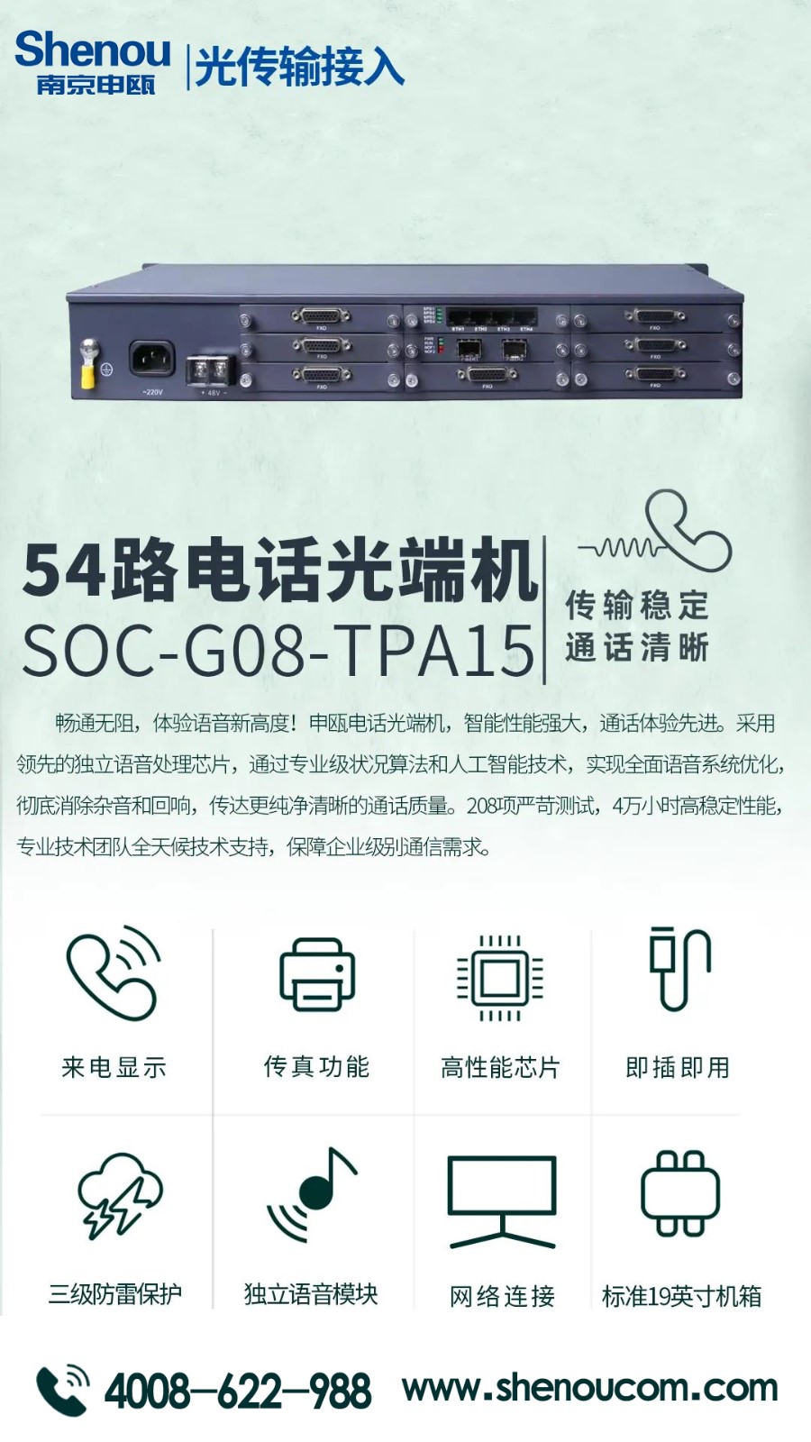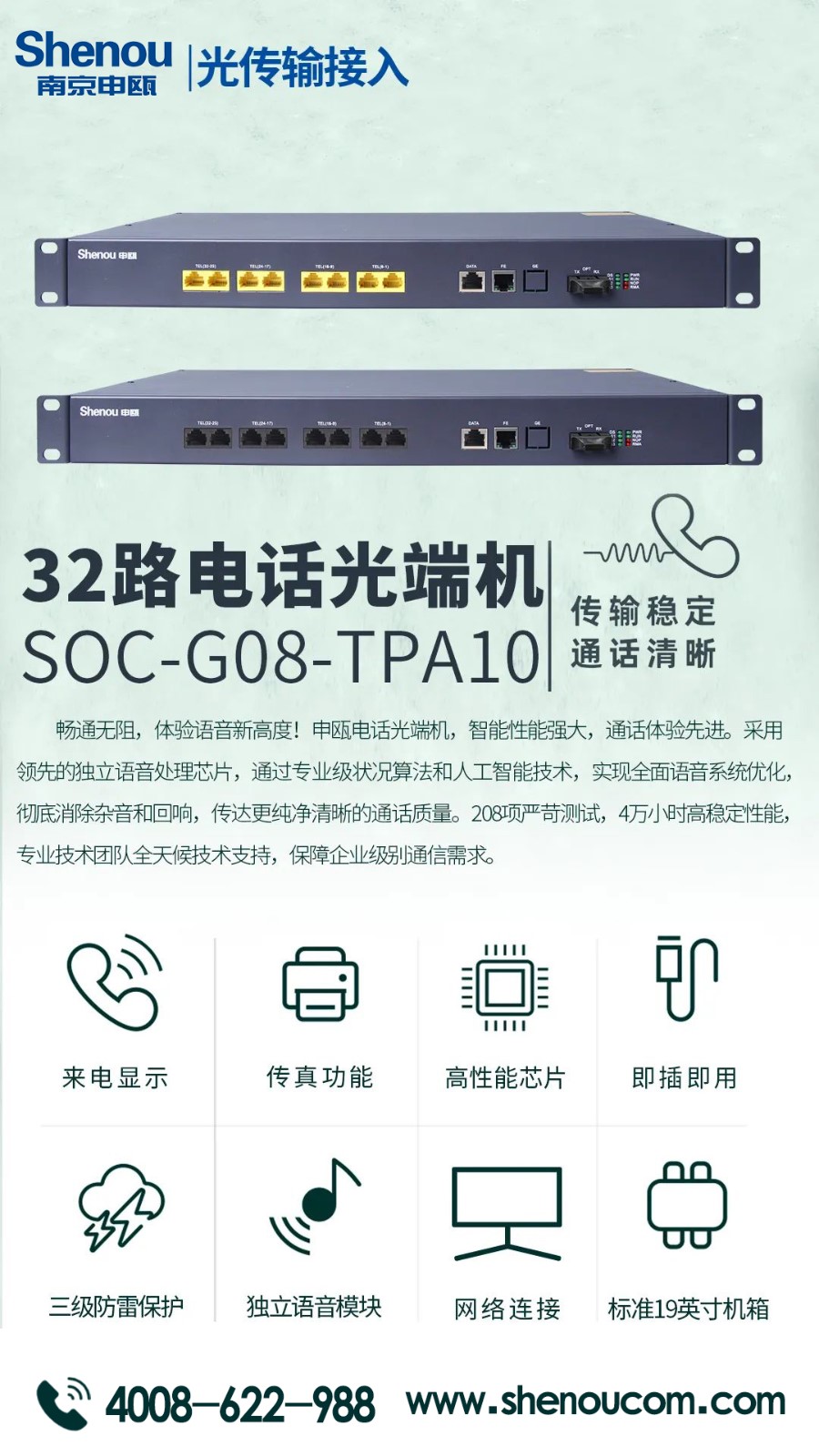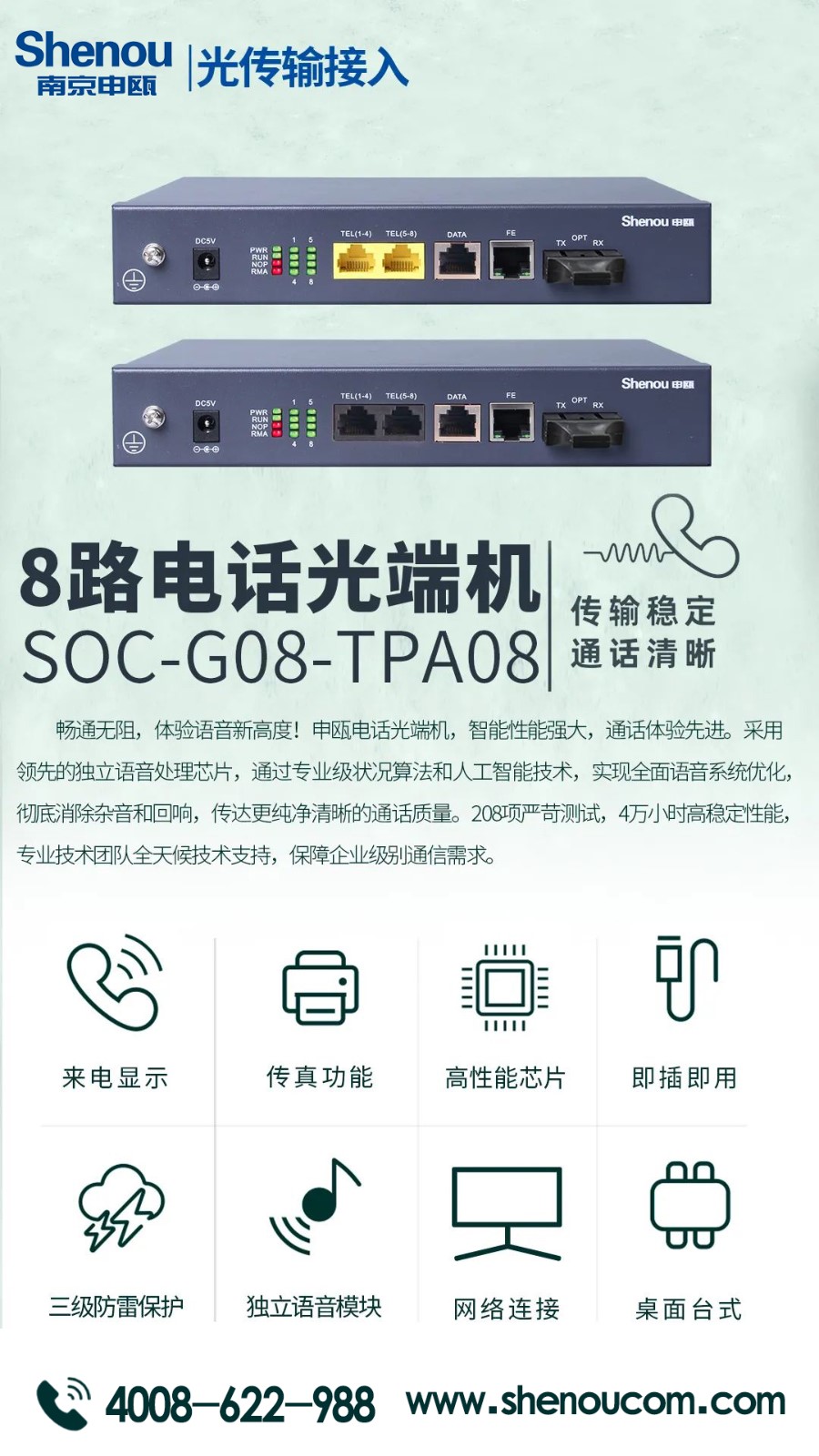申甌通信的電話光端機(jī),它采用先進(jìn)的光纖技術(shù),具有高速、穩(wěn)定、低延遲等優(yōu)點(diǎn),可以滿足各種通信需求。是一款高品質(zhì)、高性能的通信設(shè)備。同時(shí)還具有多種功能,如來電顯示、傳真功能、網(wǎng)絡(luò)連接等,可以幫助您更加高效地進(jìn)行工作和生活。我們公司一直致力于為客戶提供最好的產(chǎn)品和服務(wù)。