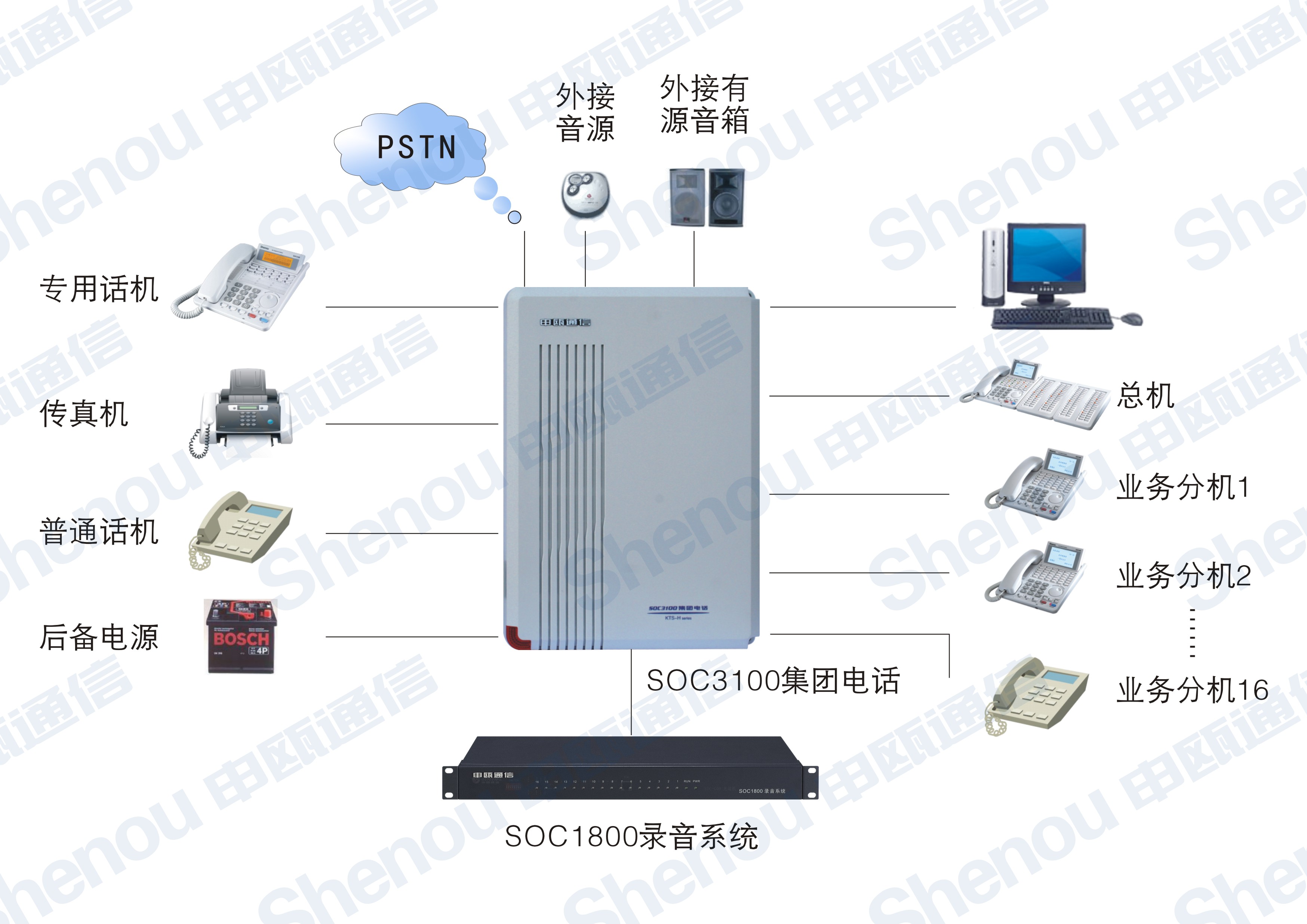 13.配置外置音源接口:用戶可選用電腦音源或其他音源做為集團(tuán)電話的轉(zhuǎn)接背景音樂(lè)。
