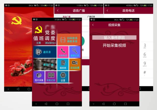 移動調(diào)度APP根據(jù)不同手機使用者的權(quán)限,實現(xiàn)對通訊錄功能、政務(wù)電話、語音通播、現(xiàn)場視頻采集功能、現(xiàn)場照片\錄音采集功能、查看值班室通信記錄、執(zhí)行值班表管理。