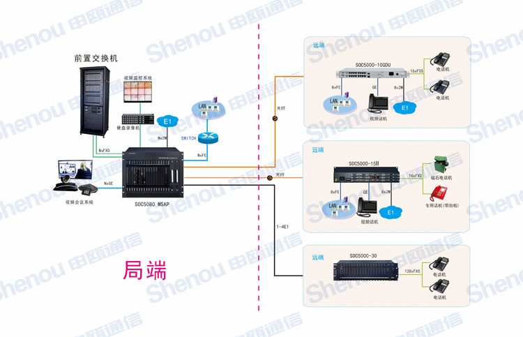 SOC-H03型話路復(fù)用器是利用E1(G.703)接口傳輸30路二線環(huán)路音頻或2/4線載波音頻的通信設(shè)備,并且有語音保密功能,特別適用于有光纜鋪設(shè)而無電纜鋪設(shè),或語音需要保密(如部隊)的場合,利用SOC-H30話路復(fù)用器可以使一個集團公司或一個系統(tǒng)單位共用一臺程控用戶交換機,不僅便于管理和維護,而且還可以降低成本,電信運營商可以作為遠端模塊使用。增強型SOC-H30話路復(fù)用器也可利用n*64K的傳輸方式一部分傳語音,一部分傳以太網(wǎng)數(shù)據(jù)或其它業(yè)務(wù),并且直接同具有中國一號信令、中國七號信令或PRI信令的E1接口相連接,實現(xiàn)2M的遠端接入。