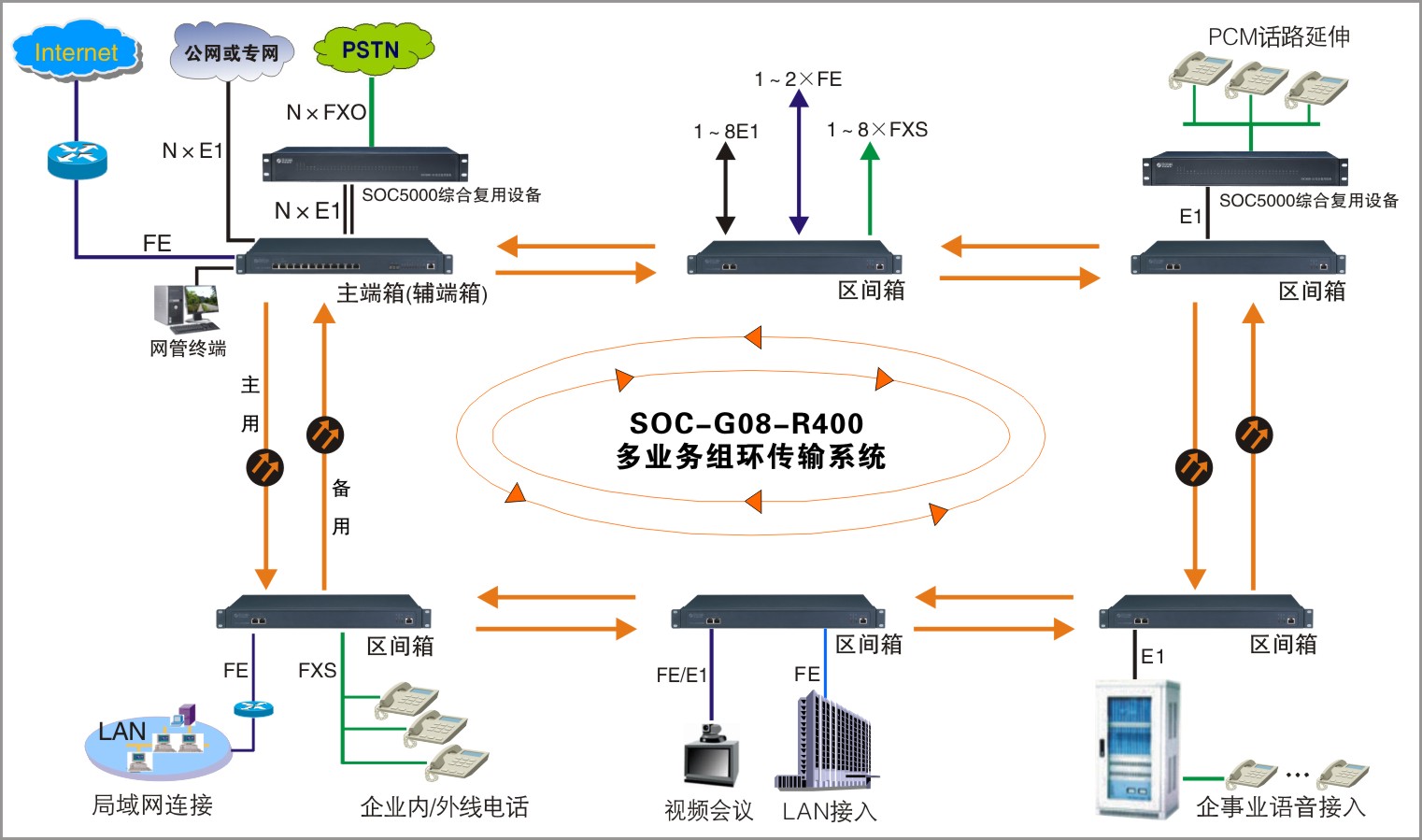 SOC-G08-R400多業(yè)務(wù)傳輸系統(tǒng)主要由一個主端站點(diǎn)和若干個區(qū)間站點(diǎn)設(shè)備組成,這些設(shè)備的不同組合,可組成環(huán)型、鏈型、點(diǎn)對點(diǎn)不同的網(wǎng)絡(luò)拓?fù)浣Y(jié)構(gòu),實(shí)現(xiàn)2M、10/100M以太網(wǎng)、語音等多業(yè)務(wù)的綜合傳輸。系統(tǒng)采用二纖單向通道倒換環(huán)技術(shù),線路1