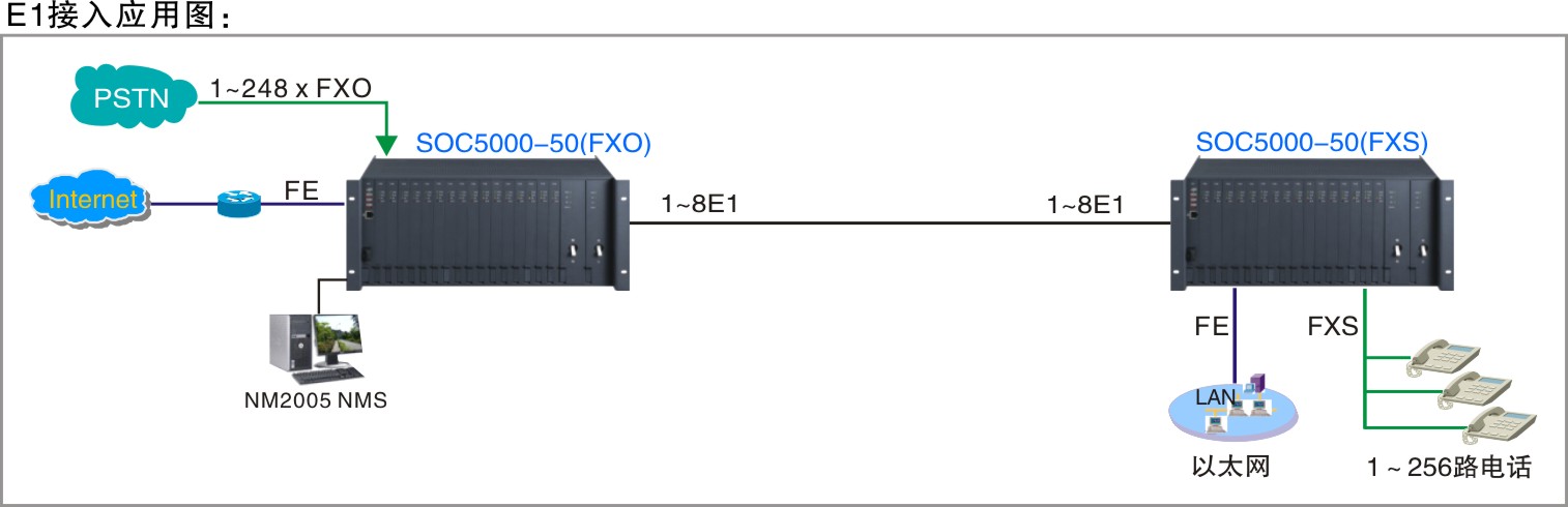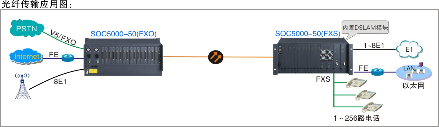 SOC5000-50是根據(jù)當(dāng)前客戶對接入方式與業(yè)務(wù)需求多樣化而研發(fā)的綜合接入設(shè)備,主要用于語音、數(shù)據(jù)通信網(wǎng)絡(luò)中的各種業(yè)務(wù)接入、復(fù)用、傳輸。設(shè)備采用19英寸5U標(biāo)準(zhǔn)機(jī)箱,19槽插卡式結(jié)構(gòu)設(shè)計。集成PDH/SDH/E1/V5等多種線路接口,支持FXO/FXS/DSL/E1/數(shù)據(jù)盤等各種業(yè)務(wù)盤卡的大容量業(yè)務(wù)接入以及混插技術(shù),充分體現(xiàn)其靈活和兼容性,為客戶在原有傳輸構(gòu)架上提供性價比更高的傳輸接入方案,特別適用于“光進(jìn)銅退”工程綜合業(yè)務(wù)接入。此系列產(chǎn)品也能起到多通道保護(hù),當(dāng)設(shè)備選擇E1通道傳輸?shù)臅r候,任意1個E1可以傳輸128路語音,節(jié)約E1資源;還可起到“1+7通道保護(hù)”的功能,并且切換期間能保持話路通暢;同時起到保密跟線路檢測的功能。其廣泛應(yīng)用于各運營商、廣電網(wǎng)和公安、部隊(保密)、電力、鐵路、公路、交通、金融、政府及具有分支機(jī)構(gòu)的企事業(yè)單位專網(wǎng)。