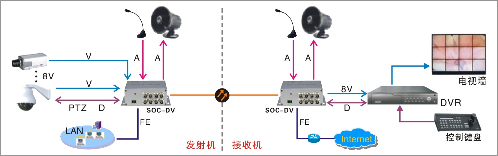 SOC-DV系列視頻光端機(jī)采用先進(jìn)的數(shù)字視頻及光纖傳輸技術(shù),將視頻信號在單芯光纖上實(shí)時(shí)同步、無失真、高質(zhì)量地傳輸。此系列產(chǎn)品可根據(jù)用戶要求配置成多路雙向視頻、音頻、異步數(shù)據(jù)等業(yè)務(wù)。SOC-DV視頻光端機(jī)采用全數(shù)字視頻無壓縮傳輸技術(shù),高質(zhì)量的視頻效果可滿足用戶的需求, 安裝簡便易行, 無需進(jìn)行現(xiàn)場調(diào)節(jié), 穩(wěn)定性高 。該光端機(jī)采用結(jié)構(gòu)模塊化設(shè)計(jì),用戶可根據(jù)現(xiàn)場具體情況靈活選擇或定制配置,SOC-DV04/08系列視頻光端機(jī)板卡也可插入SOC-30JX19機(jī)箱中,19"集中式機(jī)箱直接上架,作為集中式視頻光端機(jī)業(yè)務(wù)板卡使用。